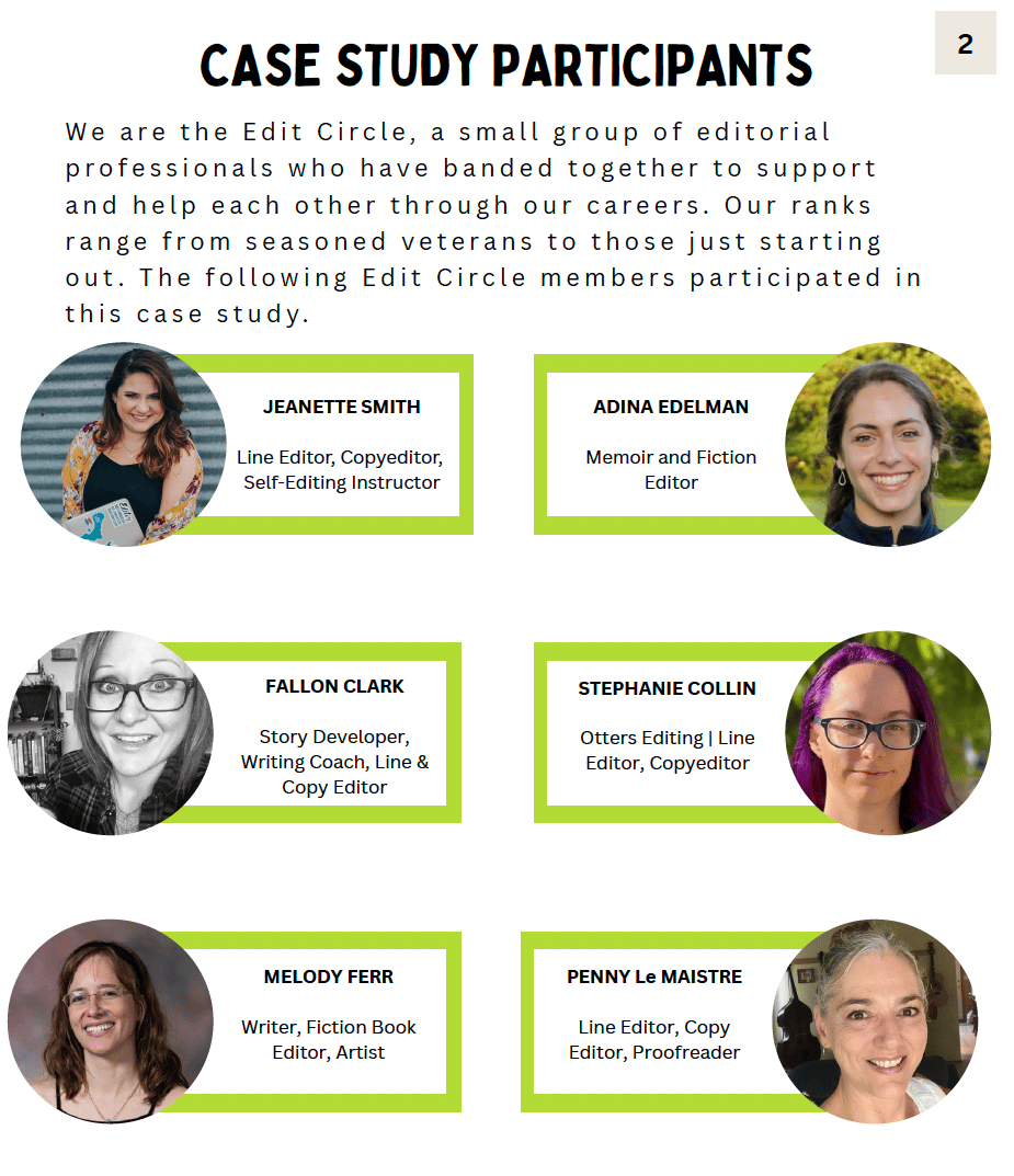 Six editors—working from the same brief and the same manuscript excerpt—each completed a line edit. And this PDF shows the results: six thoughtful, professional edits that are noticeably different in approach, tone, and focus.